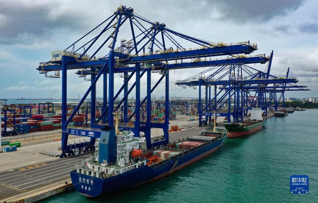 6月15日,集裝箱貨輪在海南洋浦國際集裝箱碼頭裝卸貨物(無人機照片)。新華社記者 郭程 攝