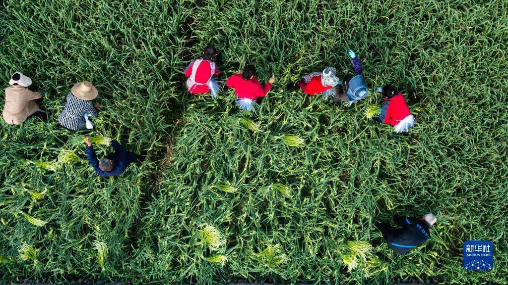 在成都市溫江區(qū)永寧街道八角社區(qū),農(nóng)民在蒜稻輪作田里采收蒜薹(3月23日攝,無人機(jī)照片)。新華社記者 沈伯韓 攝