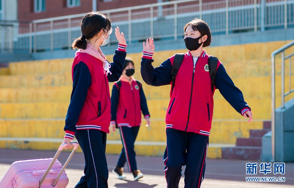 4月26日,呼和浩特市第十二中學復課,久違的同學見面后開心擊掌。新華網(wǎng)發(fā)(丁根厚 攝) 2020年4月26日,內(nèi)蒙古自治區(qū)呼和浩特市各所中學在做好疫情防控的前提下,高一、高二年級,初一、初二年級有序返校復學。這是呼和浩特第二批次學校開學,高三、初三年級已于3月30日復課。 -