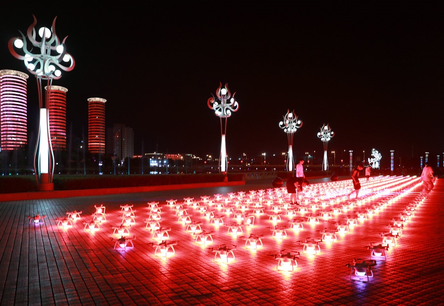 7月30日凌晨1:10,500架無人機在呼和浩特東河廣場騰空而起,如點點星光組成的動態(tài)燈光秀,幻化成20余幅震撼畫面,“建設(shè)亮麗內(nèi)蒙古,共圓偉大中國夢”、“江山就是人民,人民就是江山”、“一心聽黨話,鐵心跟黨走”、“草原兒女心向黨”、“蒙古馬精神”、“亮麗內(nèi)蒙古”、“美麗青城草原都市”等一幅幅絢麗的文字和畫面,配上動感激昂的音樂,效果驚艷,現(xiàn)場觀眾贊嘆連連。